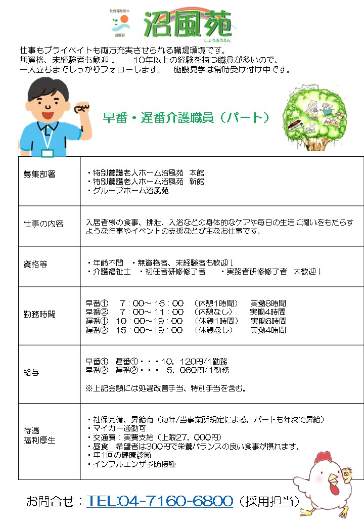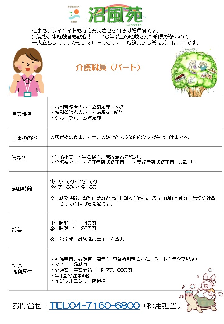 沼風苑では、以下の人材を募集しています。